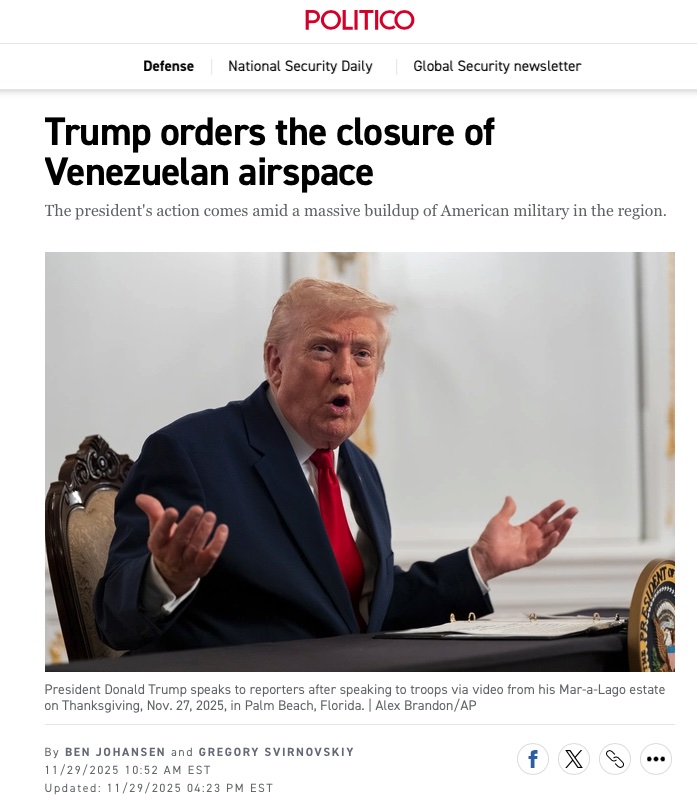 The administration is all around the world stirring the pot in our name. In addition to killing people and taking out small boats in the Caribbean, the U.S. is seizing oil tankers off the coast of Venezuela, and Trump recently announced the closure of airspace over Venezuela: Trump orders the closure of Venezuelan airspace l POLITICO.