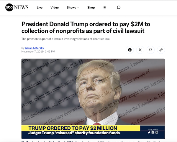 Trump’s entanglements that have resulted in findings of fraud extend beyond his profitable endeavors. A New York state judge ordered Trump “to pay $2 million to a group of nonprofit organizations as part of a settlement in a civil lawsuit stemming from persistent violations of state charities laws.” The payment resolves a case brought by the New York attorney general’s office after the Trump Foundation held a fundraiser for military veterans during the 2016 campaign. President Donald Trump ordered to pay $2M to collection of nonprofits as part of civil lawsuit – ABC News. Trump and his adult children were accused of “conflating charity with politics, repeatedly using charitable donations for personal, political and business gains, including legal settlements, campaign contributions and even to purchase a portrait of Trump to hang at one of his hotels.”