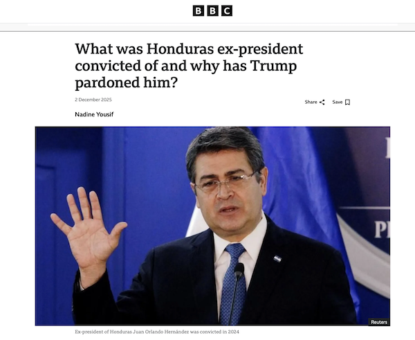 He contradicts his own stated reasons about the need to combat crime and drug use. Trump is so anti-crime and anti-violence that he recently pardoned Juan Orlando Hernandez, the former president of Honduras.